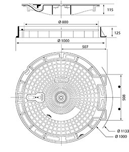 Tampão DN 800mm com sistema de dupla articulação por rótula única, abertura em 130º e trava de segurança a 90º. Anel de apoio integrado no telar garantindo a estabilidade e ausência de ruído. Fabricado conforme NBR 10160, Classe D400, recomendado para uso em vias de tráfego intenso com a passagem de veículos leves e pesados, acostamentos e estacionamentos para todos os tipos de veículos. Item opcional: Trava antiabertura.