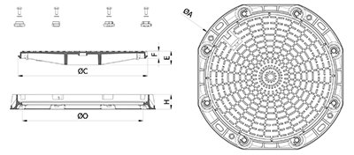 Tampão DN 800mm, não articulado, com 2 caixas de manobra laterais totalmente estanque, travamento da tampa com o telar realizado por 8 parafusos e anéis de polietileno e elastômero para eliminar o ruído e suprimir a entrada e saída de fluidos. Fabricado conforme NBR 10160, Classe D400 é recomendado para uso em vias de tráfego intenso com a passagem de veículos leves e pesados, acostamentos e estacionamentos para todos os tipos de veículos.