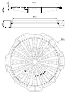 Tampão DN 700mm, articulado através de rótula única, abertura de 100°, travamento a 90°, anel de apoio integrado no telar garantindo estabilidade e ausência de ruídos. Fabricado conforme NBR 10160, Classe D400, recomendado para uso em vias de tráfego intenso com a passagem de veículos leves e pesados, acostamentos e estacionamentos para todos os tipos de veículos. Item opcional: Trava antiabertura.