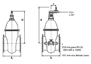 | DN | L | H | PN 10 | PN 16 | PN 25 | Nº de Voltas para Fechar |