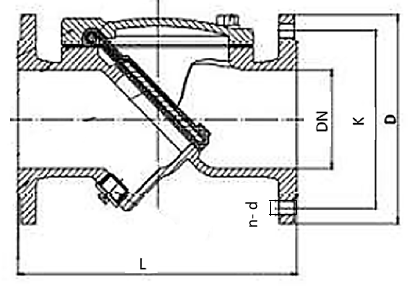 Válvula de retenção tipo portinhola emborrachada, posição a 35 para esgoto ou água bruta/potável, com flanges, DN 50 a 700 MM, classe de pressão PN 10 e PN 16 conforme BS 5153 /AWWA C 508 face a face conforme BS 5153 /AWWA C 508 furação de flanges conforme EN 1092 /ISO 7005 /NBR 7675 Corpo e tampa em ferro dúctil DIN 1693 /EN 1563 revestidos interna e externamente com epóxi pó, aplicado eletrostaticamente, portinhola em aço carbono totalmente revestida em elastômero NBR ou EPDM, eixo do obturador em aço AISI 420 totalmente encapsulado, anel de retenção da tampa em borracha NBR ou EPDM, parafusos e porcas externas fabricadas em aço SAE 1045 Plug de visita em aço carbono conforme DIN 1693.Testes de performance conforme EN 12266-1:2012.